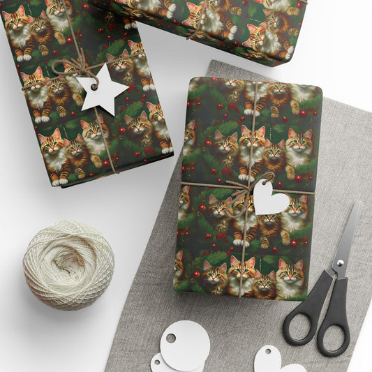 Cat Lover Christmas Wrapping Paper, Holiday Gift Wrap, Custom Cat Print Present Wrap, Festive Pine Branch Bauble Design, Matte Glossy 90gsm