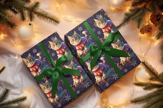 Cat on Sled Wrapping Paper, Holiday Gift Wrap, Christmas Cat Theme, Festive Present Wrap, Winter Magic Packaging, Cat Lover Gift Wrap