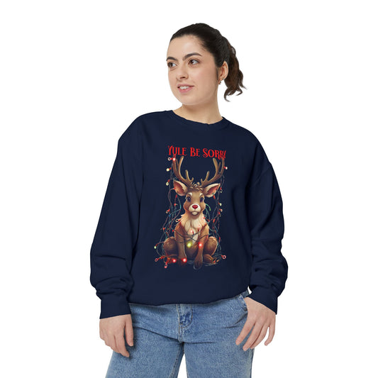 Christmas Reindeer Sweatshirt, Yule Be Sorry Cartoon Funny Holiday Jumper, Festive Cheer Winter Pullover, Unisex Garment-Dyed Sweater, Xmas