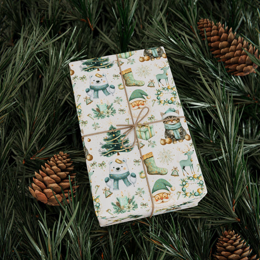 Holiday Festivities Wrapping Paper - Polar Bear, Reindeer, Santa Claus, Christmas Tree - Festive Gift Wrap, Seasonal Decor, Gift Packaging