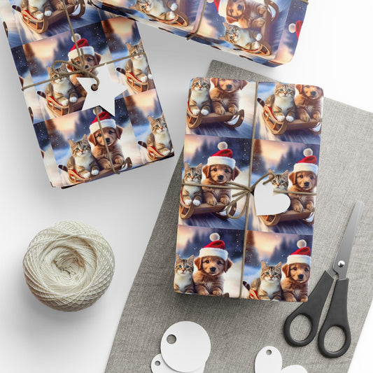 Holiday Sled Ride Wrapping Paper, Christmas Gift Wrap, Festive Cat and Dog Design, Matte or Glossy Finish, High-Quality Custom Art Paper, 3