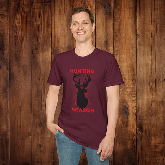 Deer Silhouette Hunting Season Unisex Softstyle T-Shirt - Wildlife Target Antlers Red Paint Splatter Tee, Hunter Gift, Outdoor Apparel,