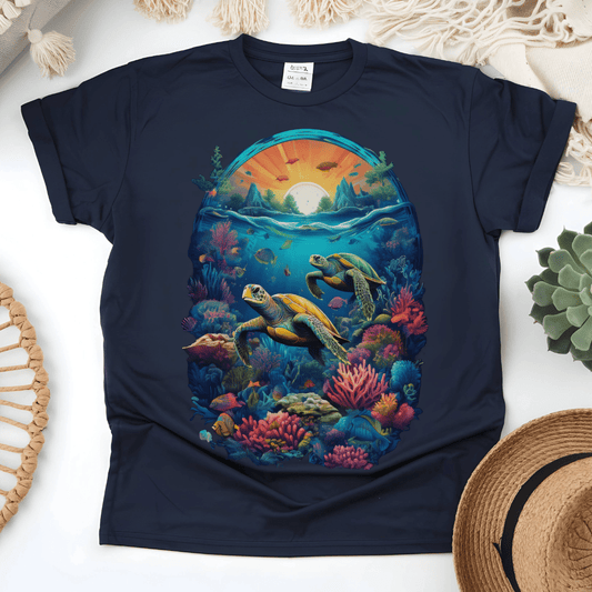 Underwater Paradise Unisex T-Shirt, Sea Turtle Tee, Ocean Sunset Shirt, Marine Life Top, Coral Reef Apparel