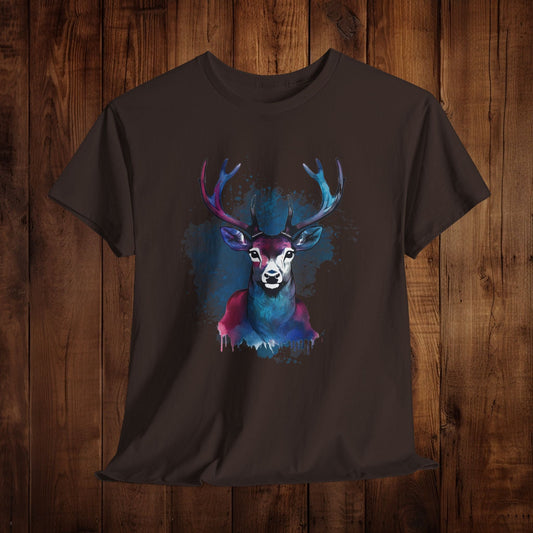 Watercolor Deer Artistic Tee, Nature Lover's T-shirt, Stylized Deer Head Shirt, Wildlife Graphic Tee, Vibrant Blue Purple Tee, Casual
